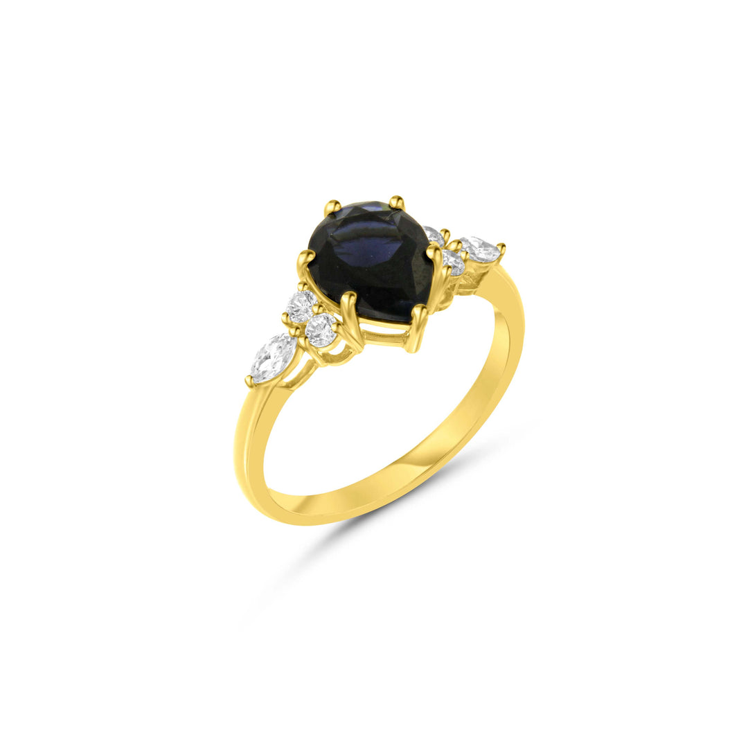טבעת מזהב צהוב 14 קראט משובצת אבן טיפה מרכזית ואבנים בצדדים