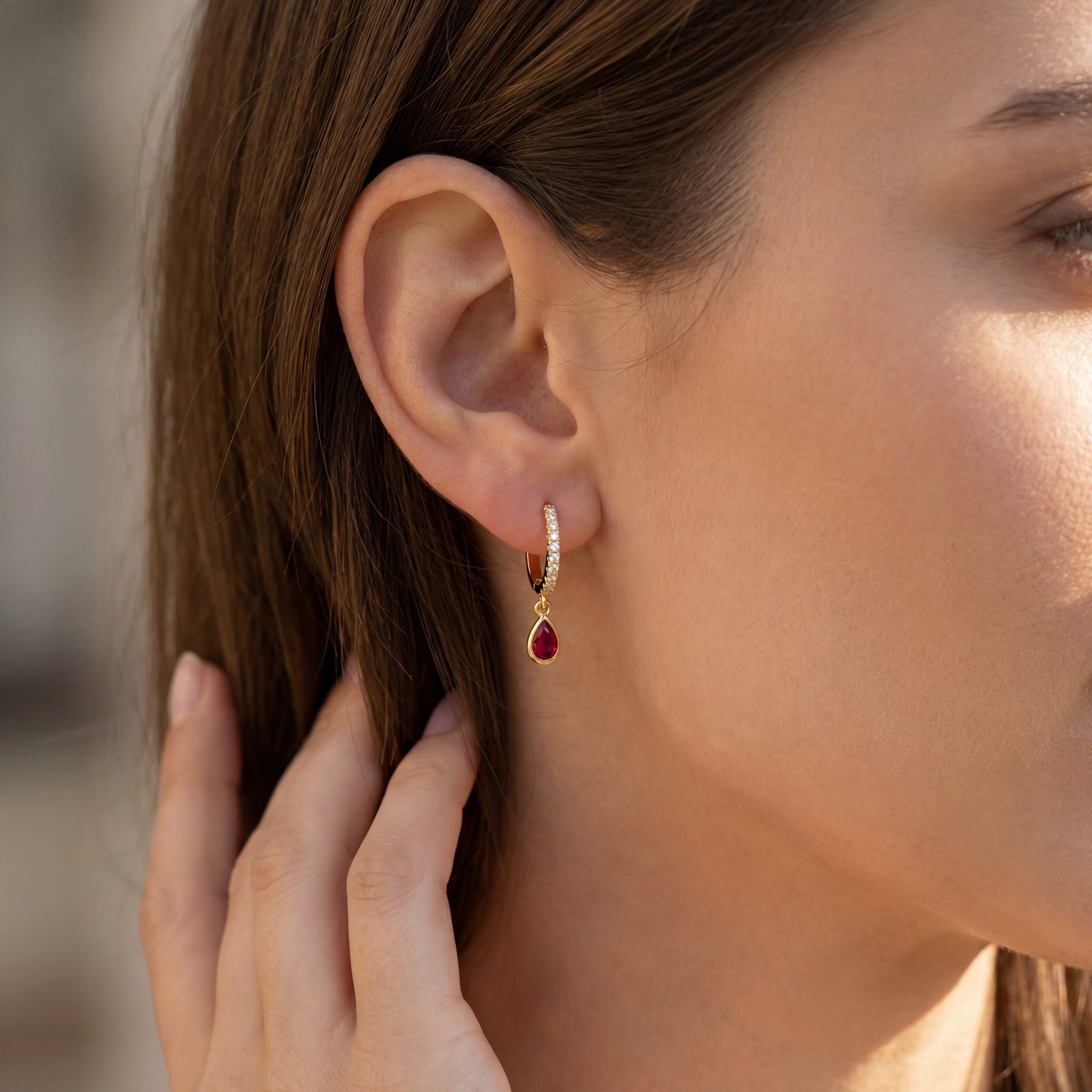 זוג עגילי חישוקים מזהב משובצים ביהלומים נוצצים וטיפות רובי בגוון ורוד מהפנטות