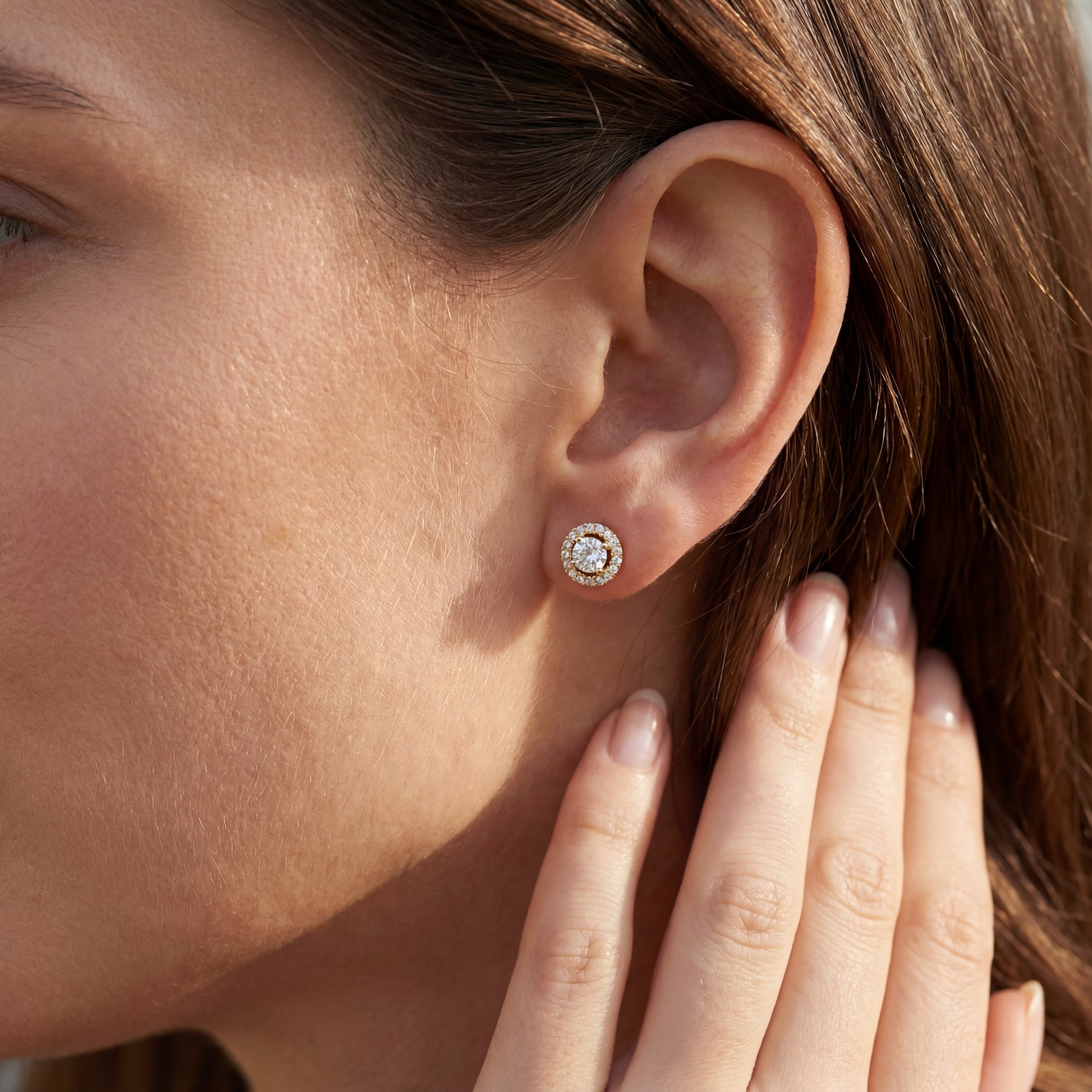 עגילים עגולים קלאסים ואלגנטים צמודים לאוזן משובצים עם אבן מרכזית ועטופים בחישוק זהב משובץ אבנים