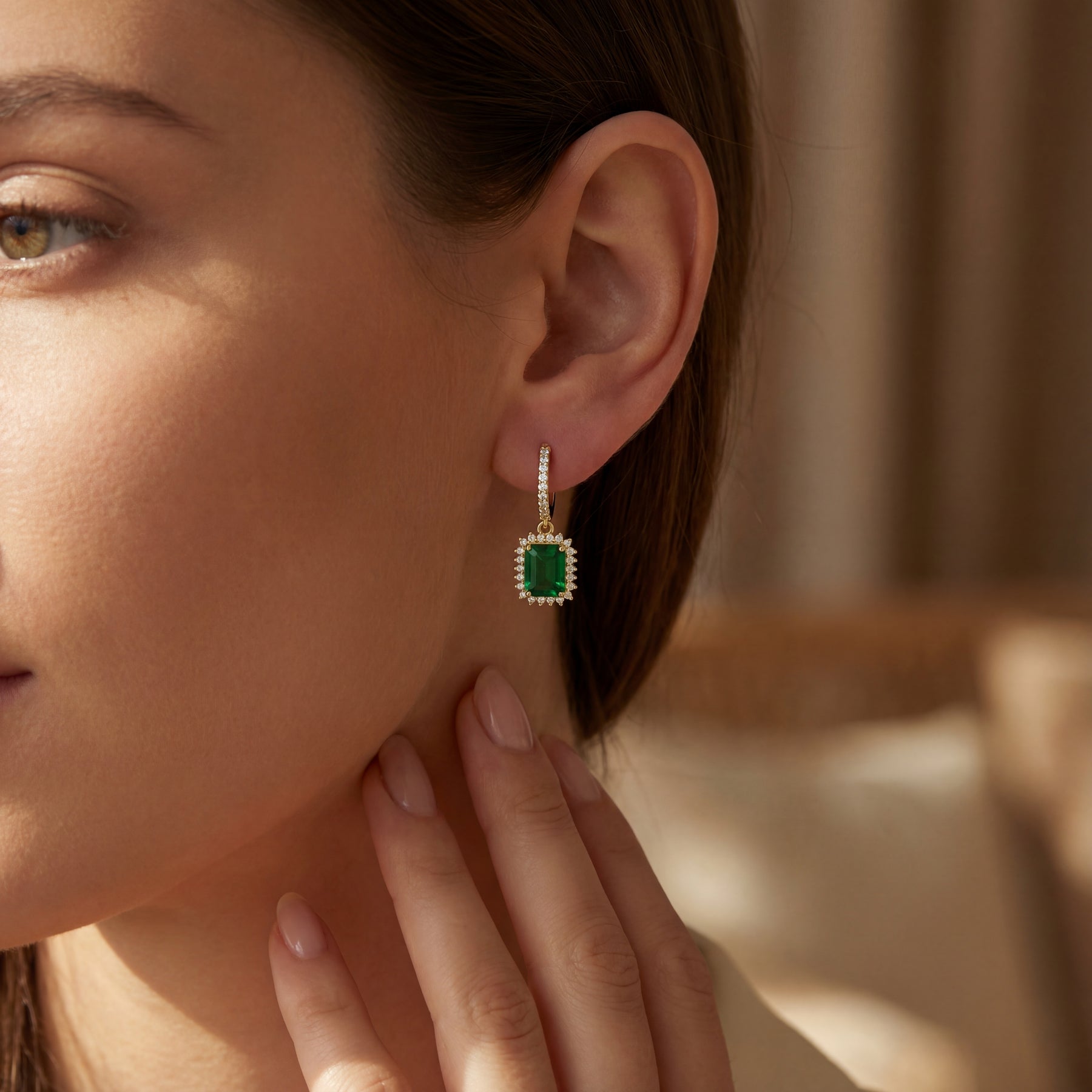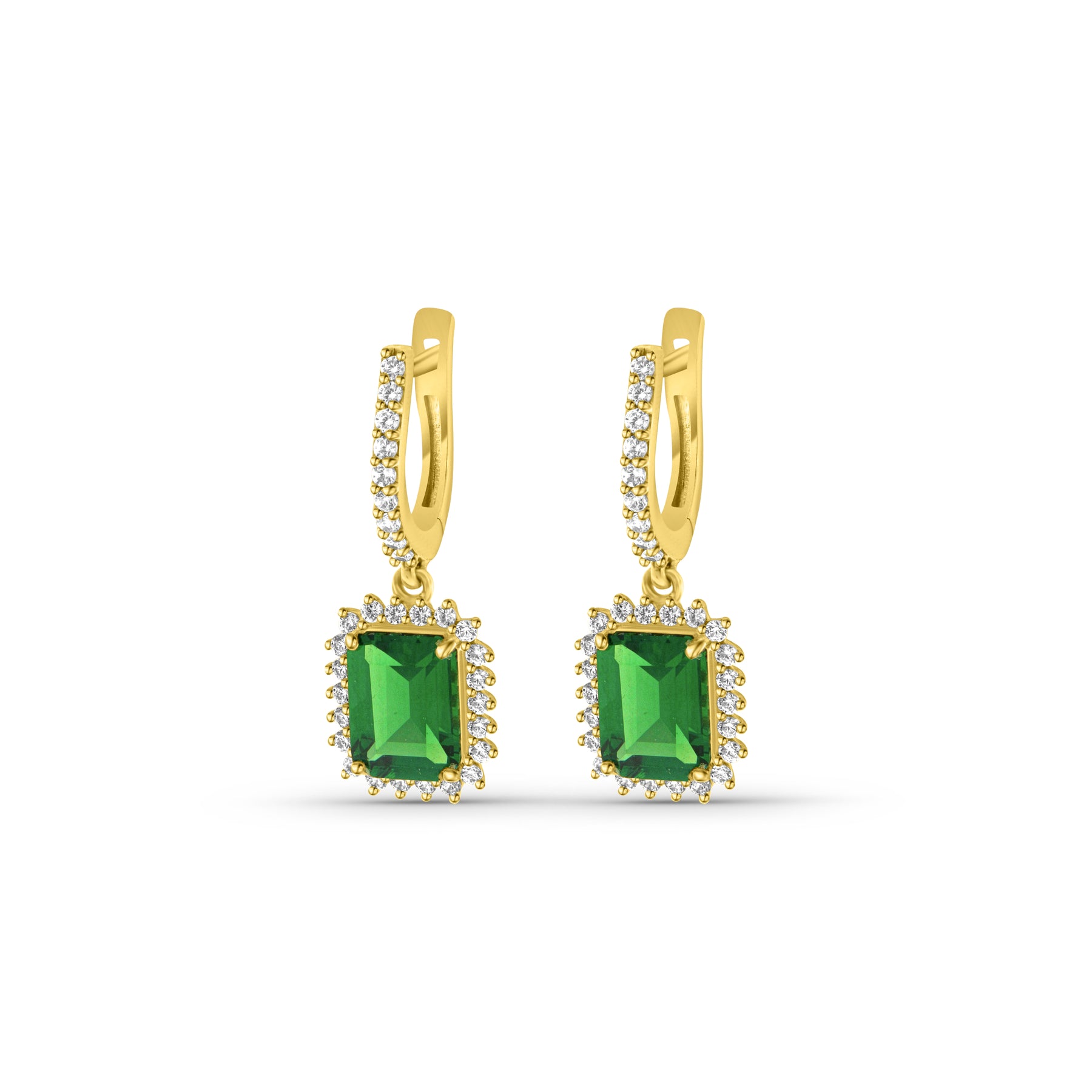 זוג עגילים תלויים מזהב משובצים באבן מלבנית מרכזית בגוון ירוק מהפנט ואבנים קטנות נוצצות מסביבה