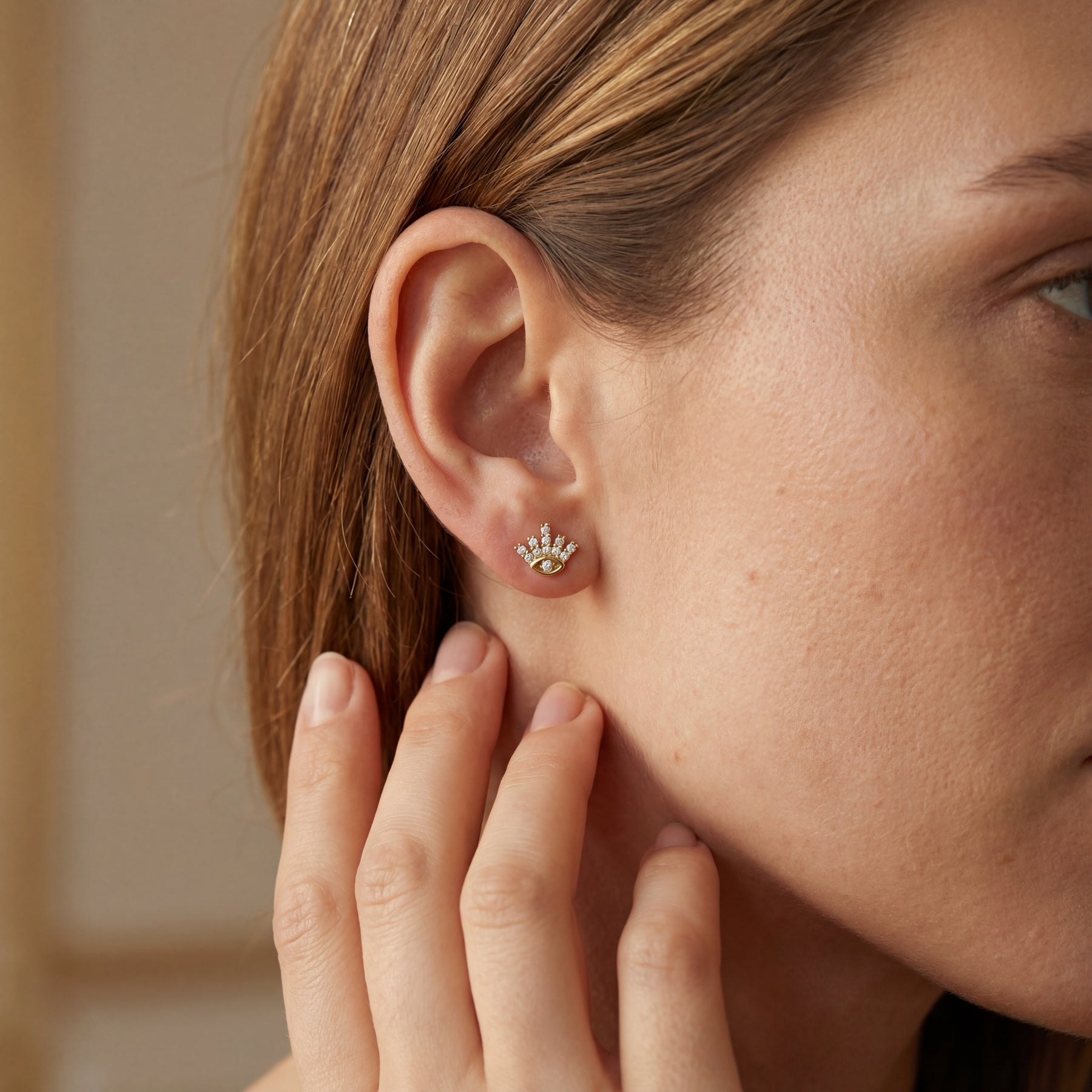זוג עגילים צמודים מזהב צהוב בעיצוב עין עם ריסים משובצים אבנים נוצצות