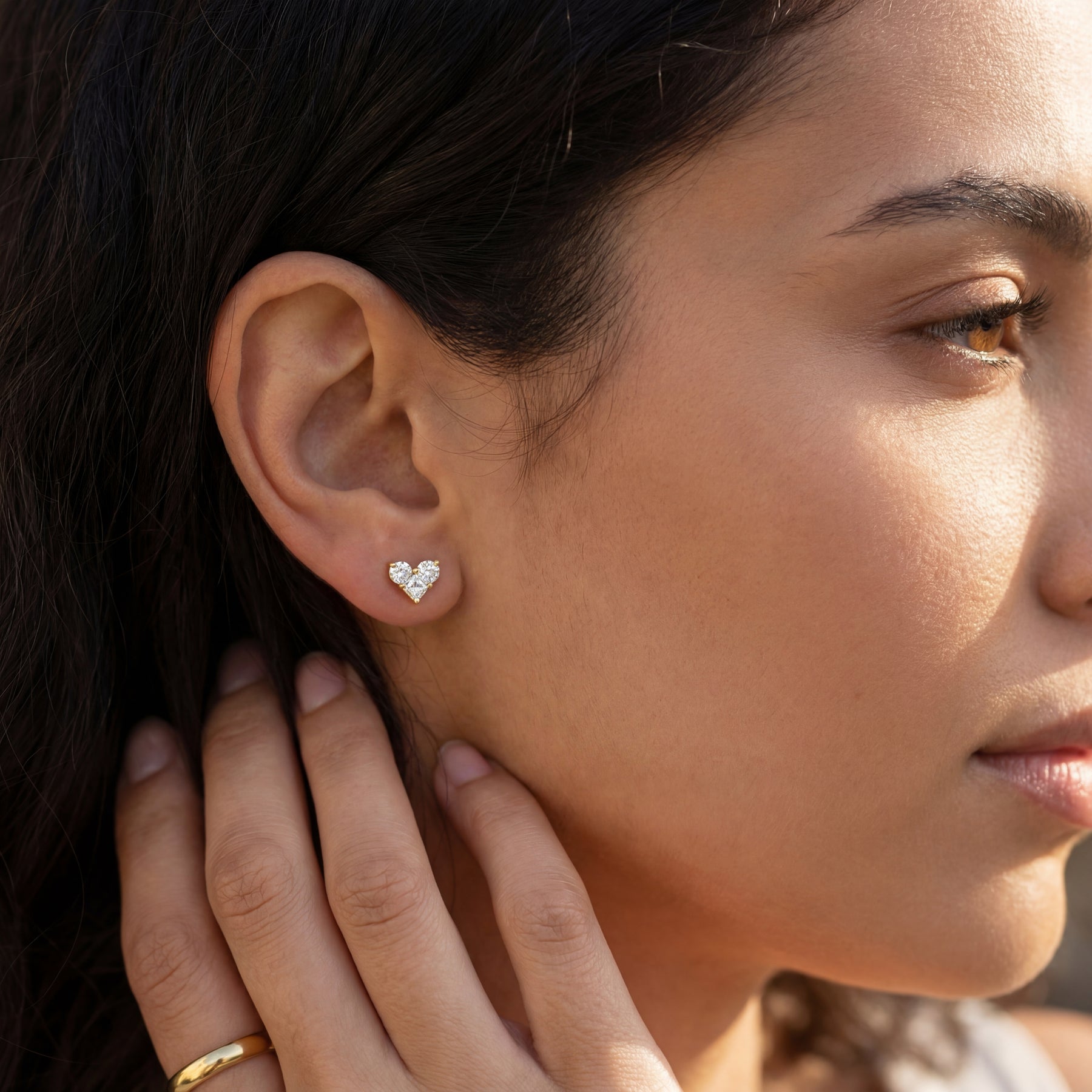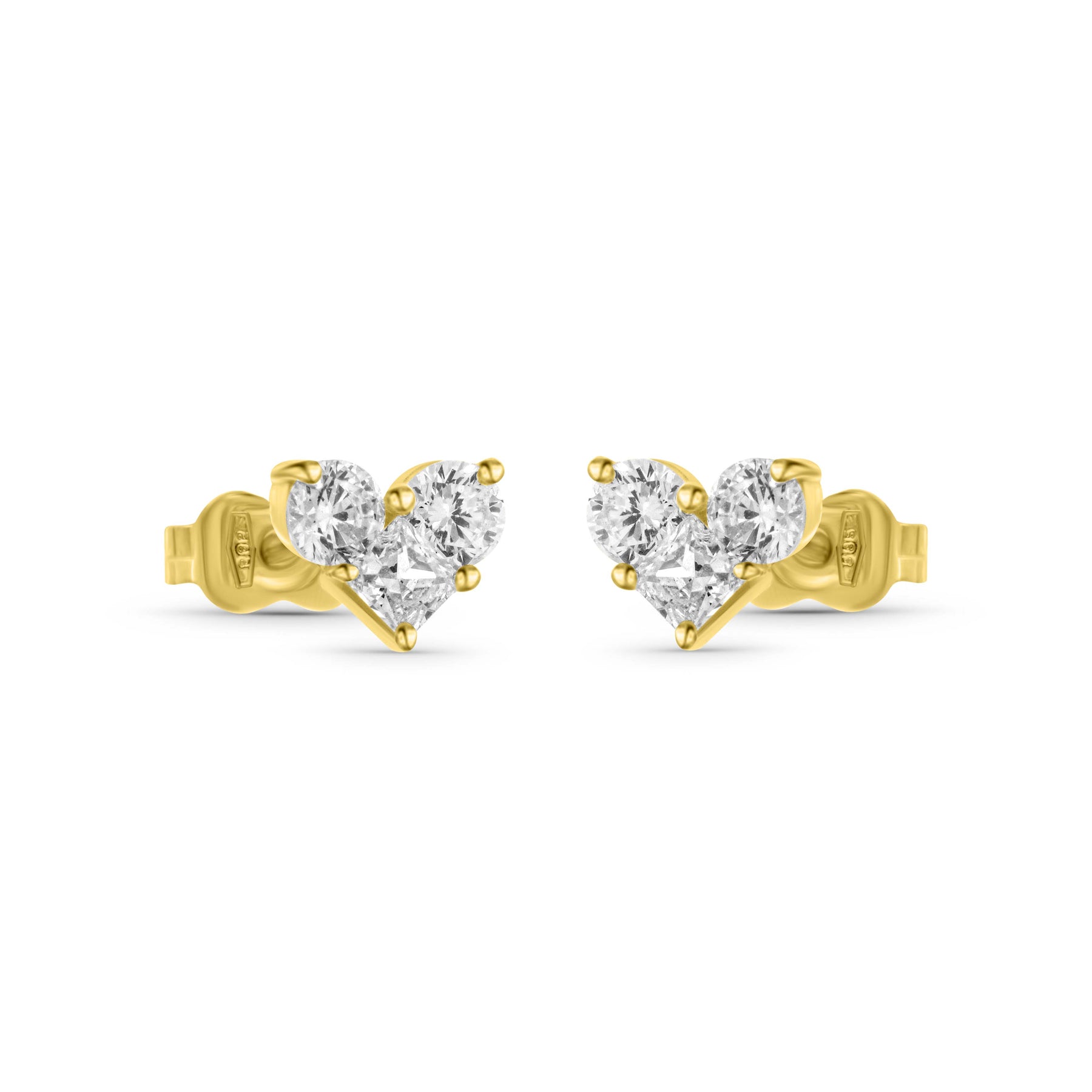 זוג עגילי לב צמודים מזהב צהוב משובצים בשלוש אבנים נוצצות