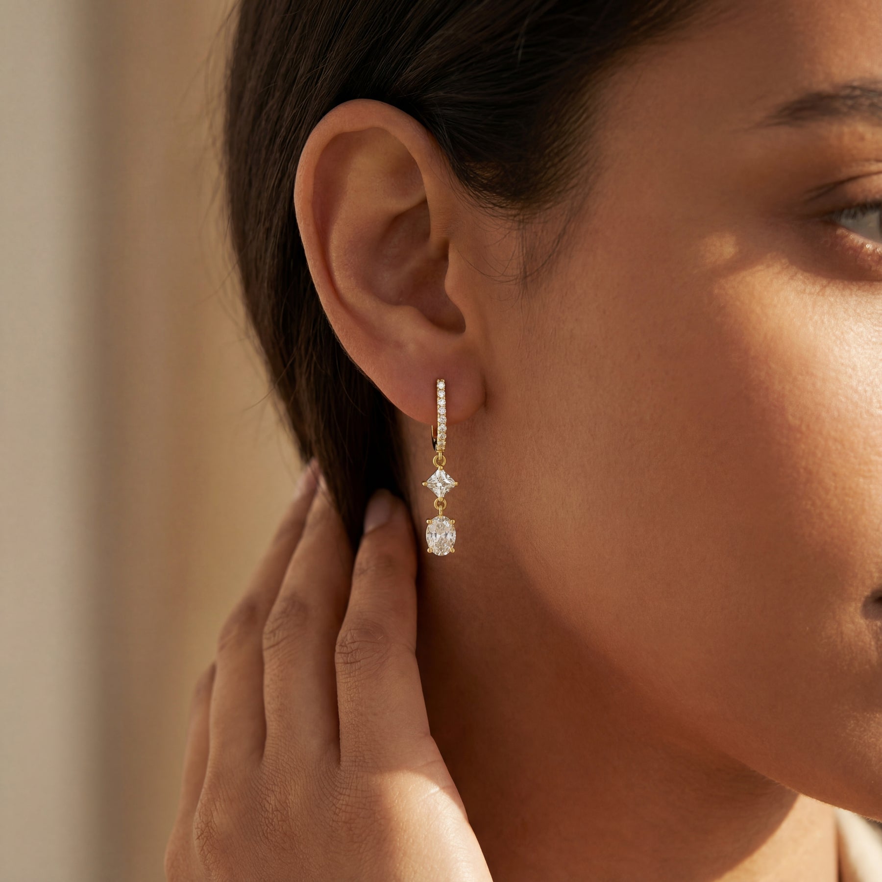 זוג עגילים תלויים מזהב משובצים באבן מרובעת בליטוש פרינסס ובאבן בליטוש אובל ובמתלה משובצות אבנים קטנות נוצצות