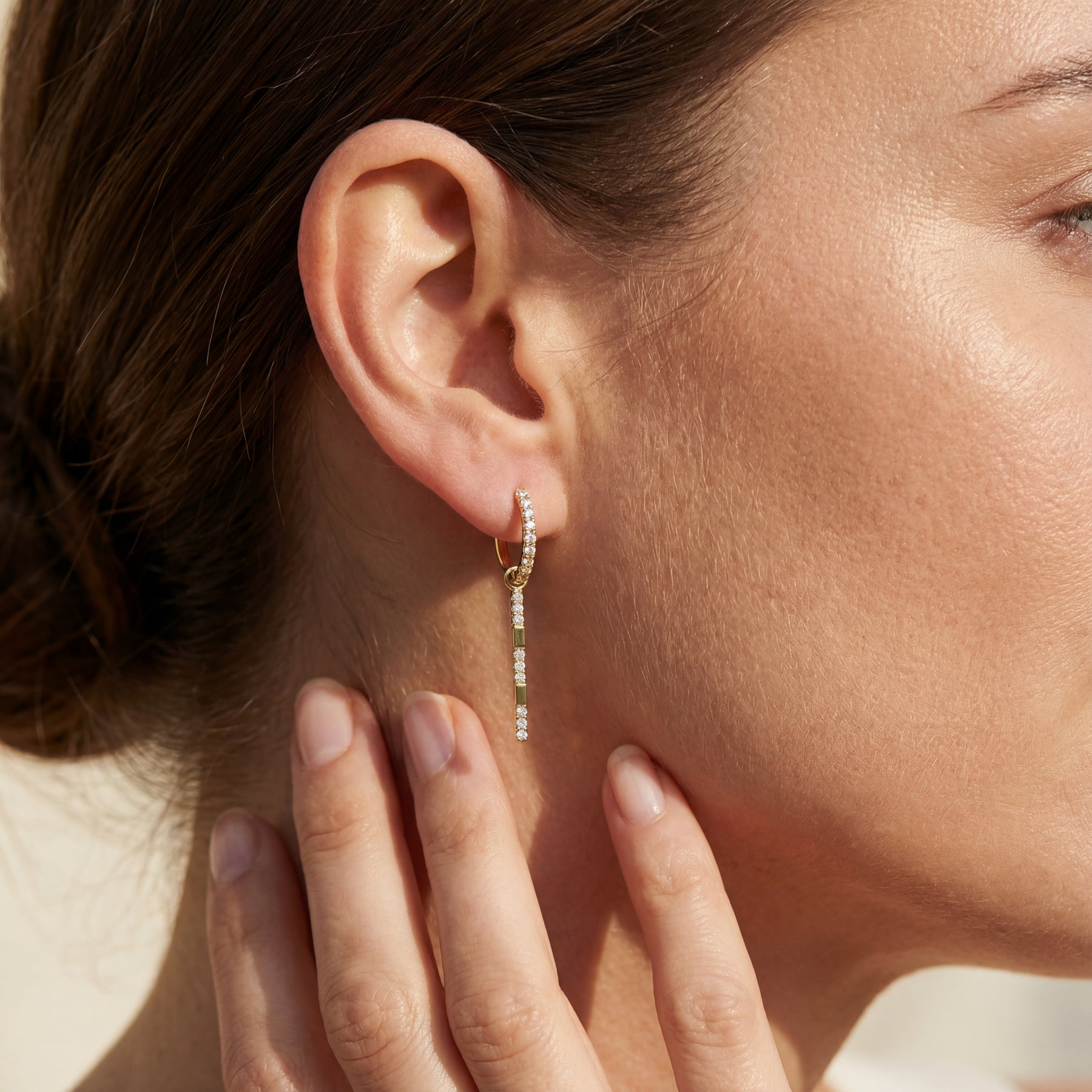 זוג עגילי חישוקים קלאסים משובצים יהלומים עם תוספת של שני תליונים ארוכים משובצים גם הם ביהלומים נוצצים