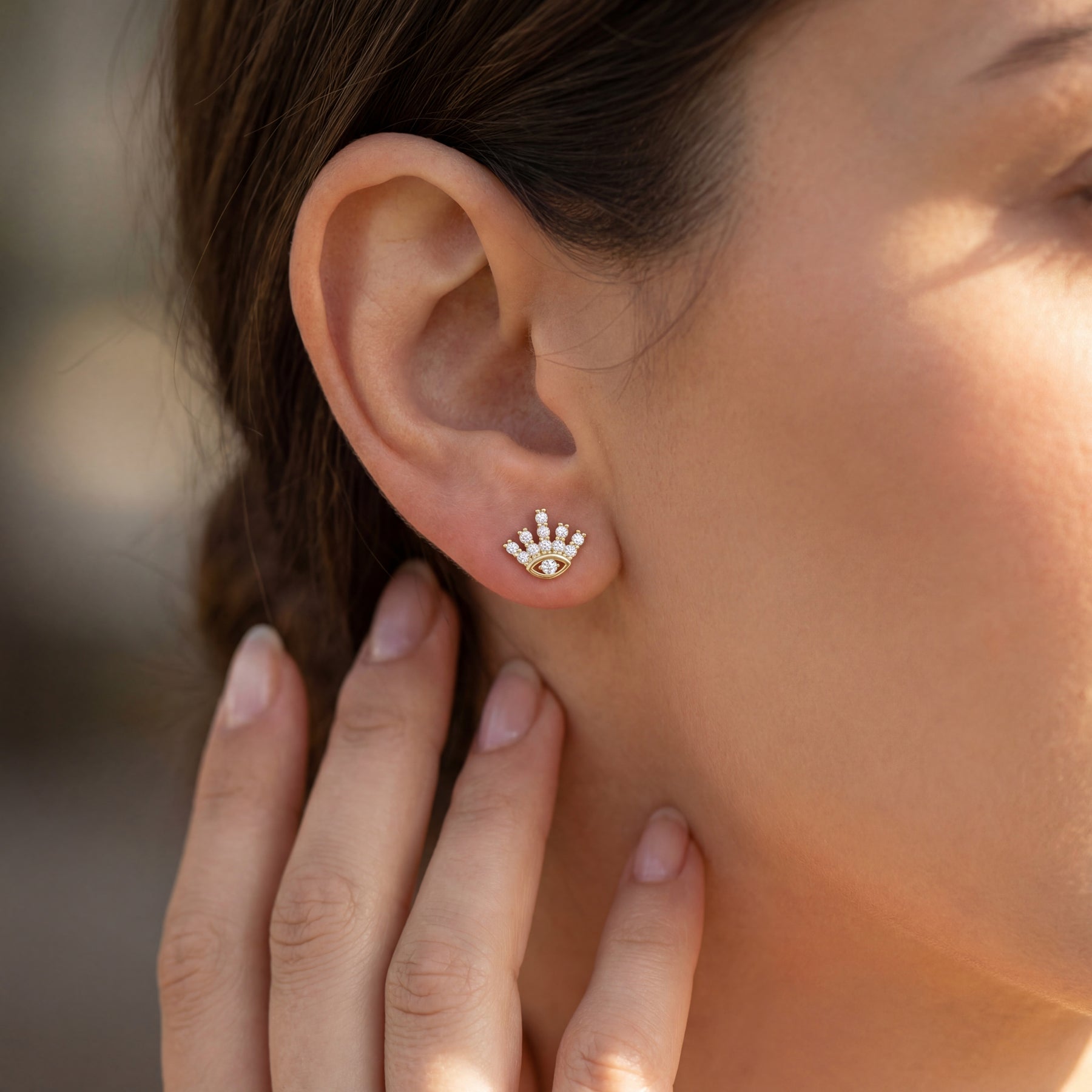 עגיל צמוד בודד מזהב צהוב בעיצוב עין עם ריסים משובץ אבנים נוצצות