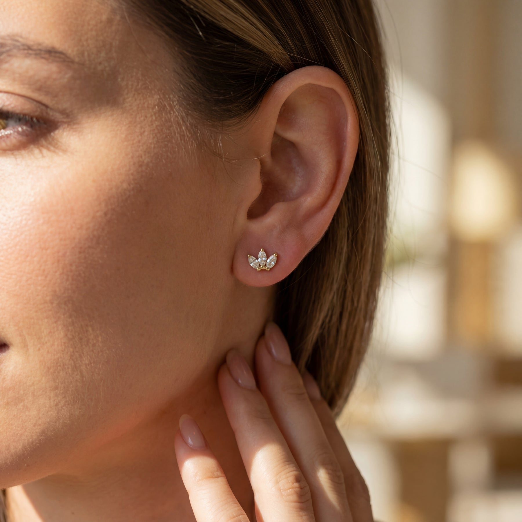 עגיל אחד צמוד מזהב בעיצוב לוטוס משובץ אבנים לבנות זוהרות ומנצנצות
