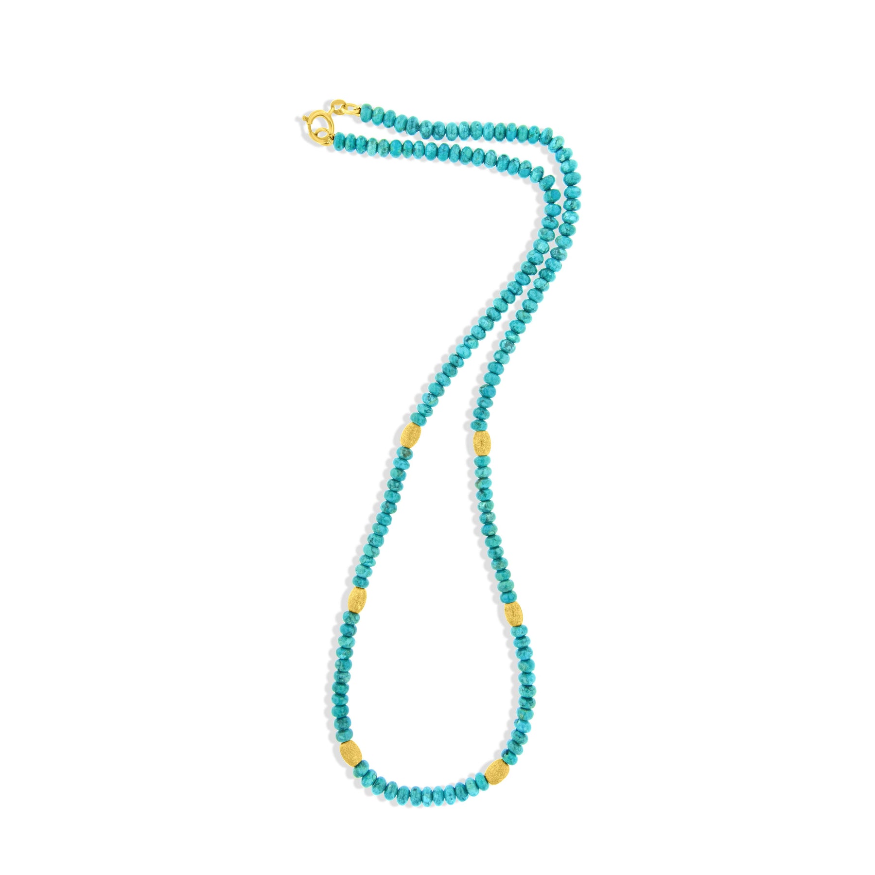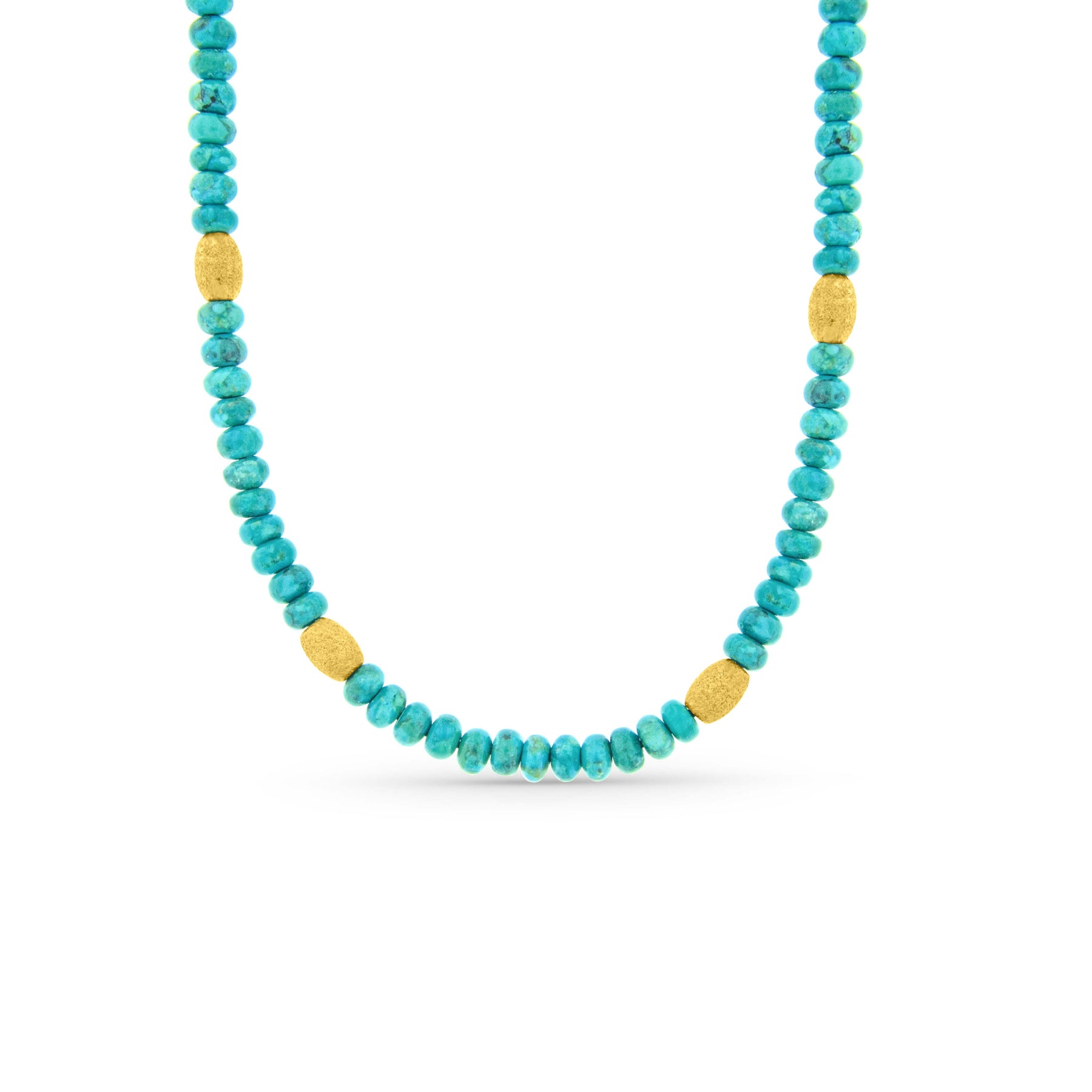 מחרוזת עבודת יד של אבני טורקיז משולבת עם חרוזים מזהב צהוב בגימור משי נוצץ