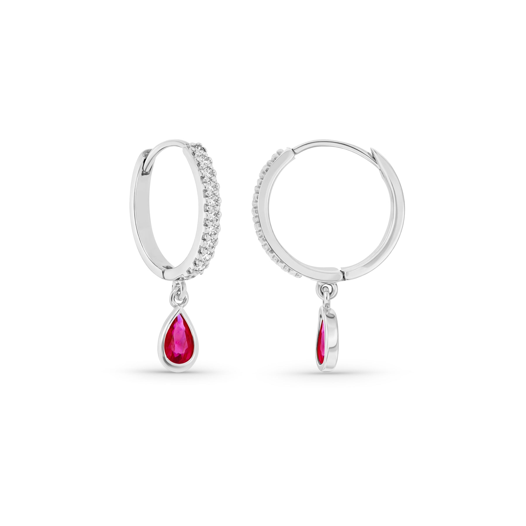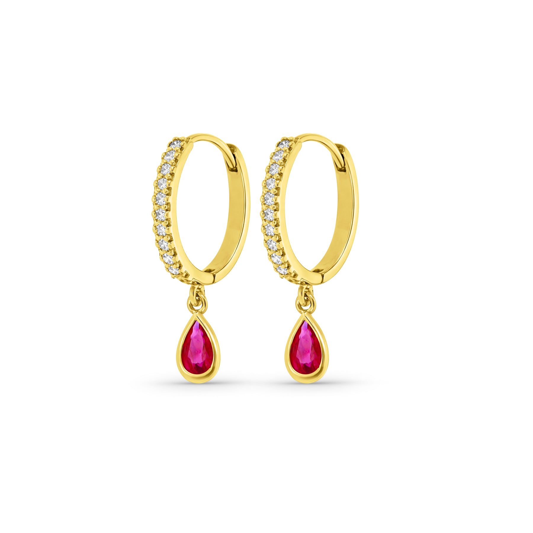 זוג עגילי חישוקים מזהב משובצים ביהלומים נוצצים וטיפות רובי בגוון ורוד מהפנטות