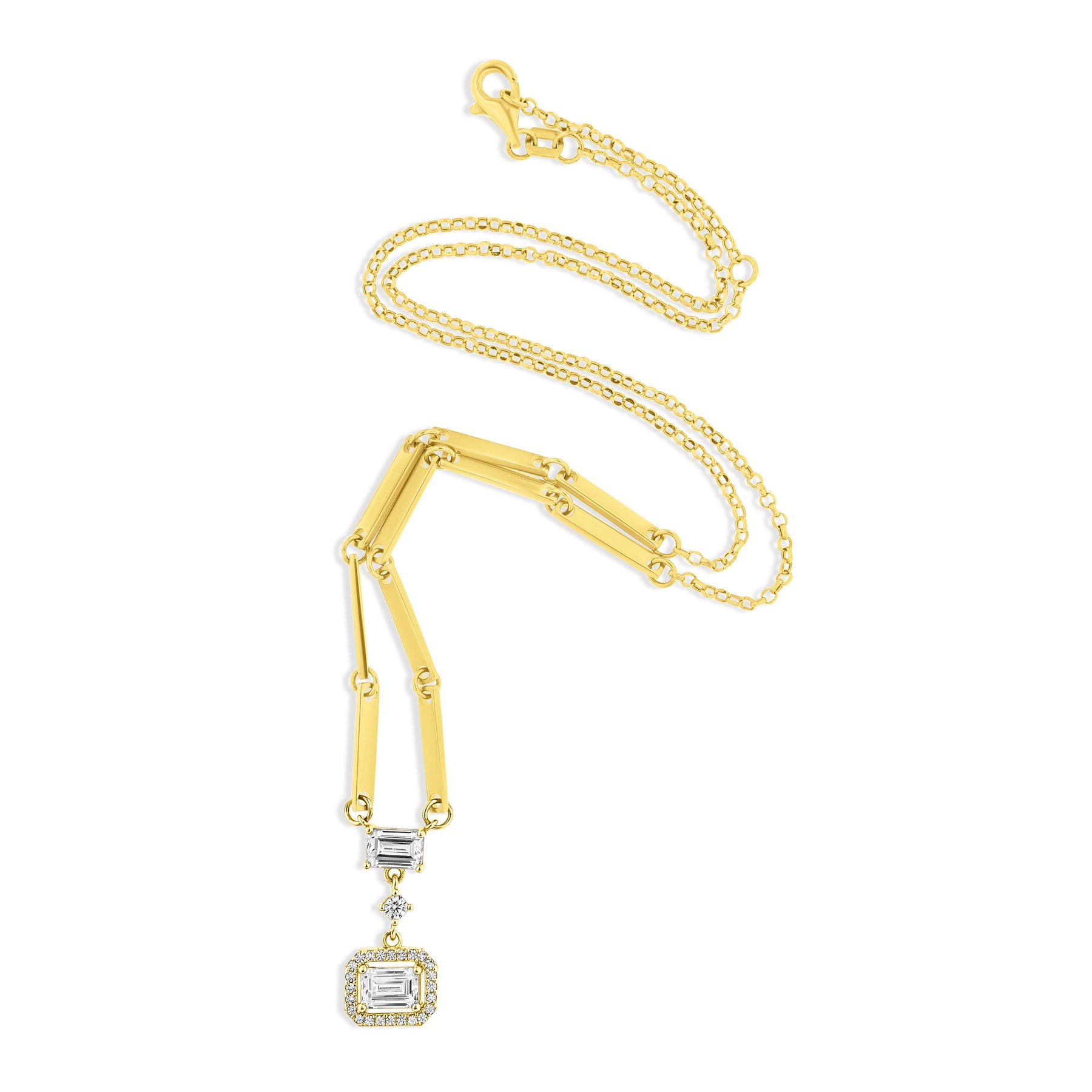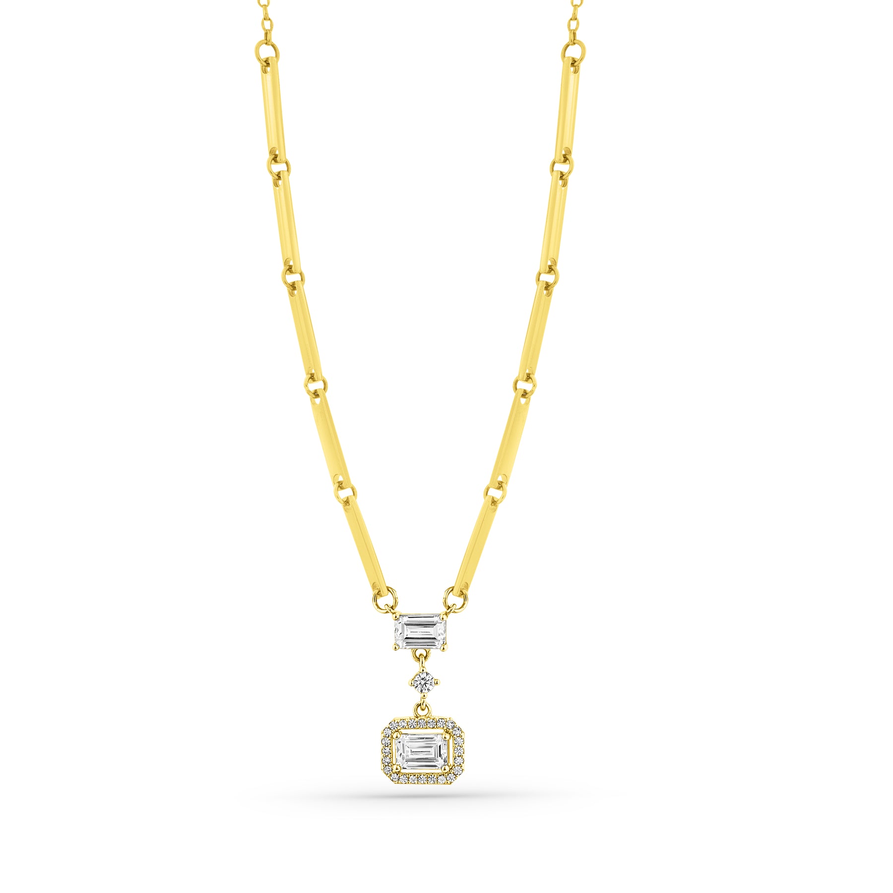 שרשרת מיוחדת מזהב צהוב עם שילוב של שרשרת חוליות ושרשרת פלטות מזהב עם תליון בקצה של אבני בגט נוצצות