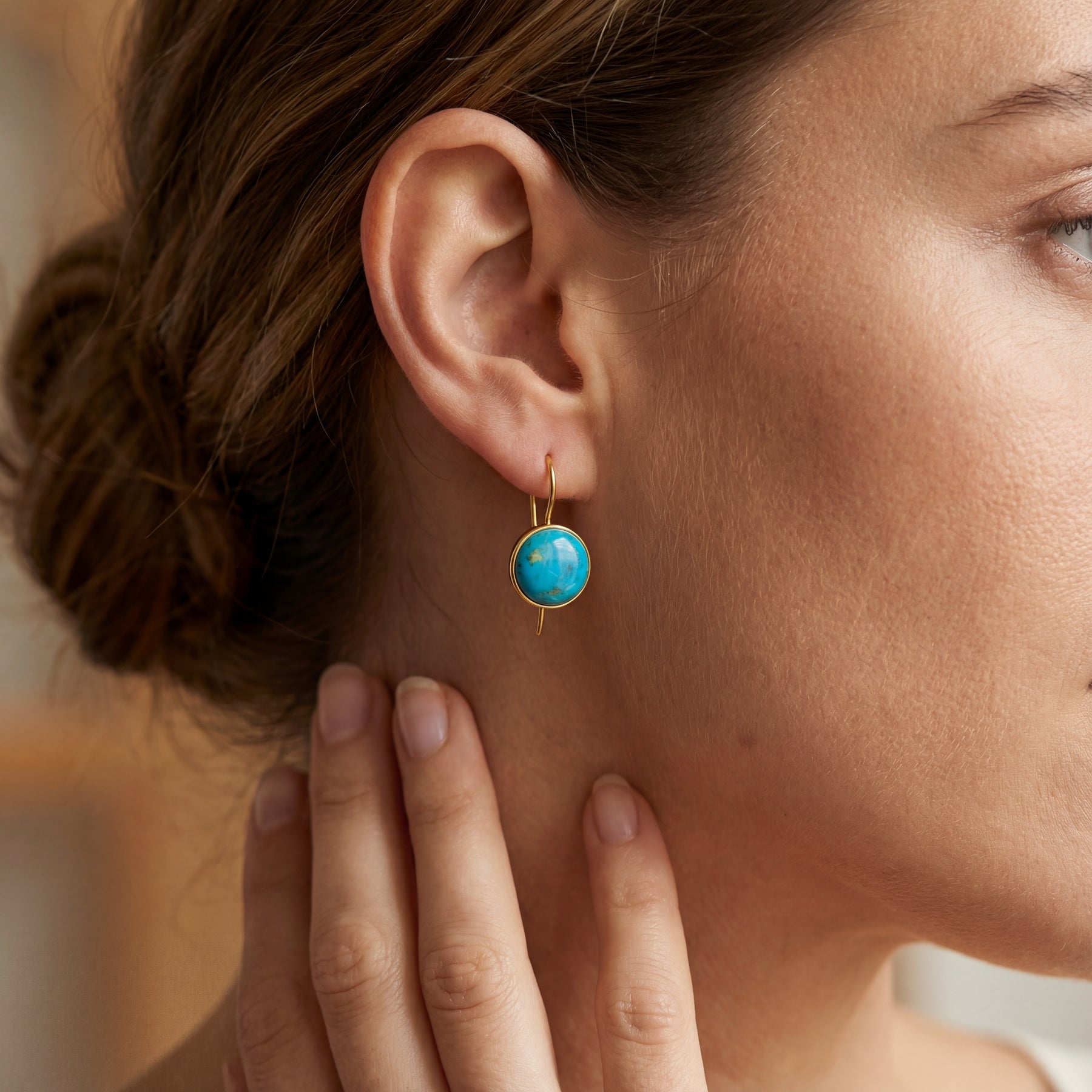 העגילים עשויים בעבודת יד מזהב 14 קראט ומשובצים באבני טורקיז טבעי דחוס