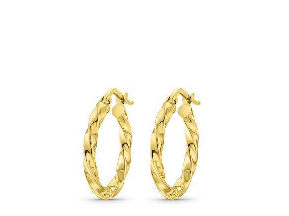 זוג עגילי חישוקים מסולסלים איטלקיים מזהב צהוב בגימור מבריק עם חריטות יהלום נוצצות