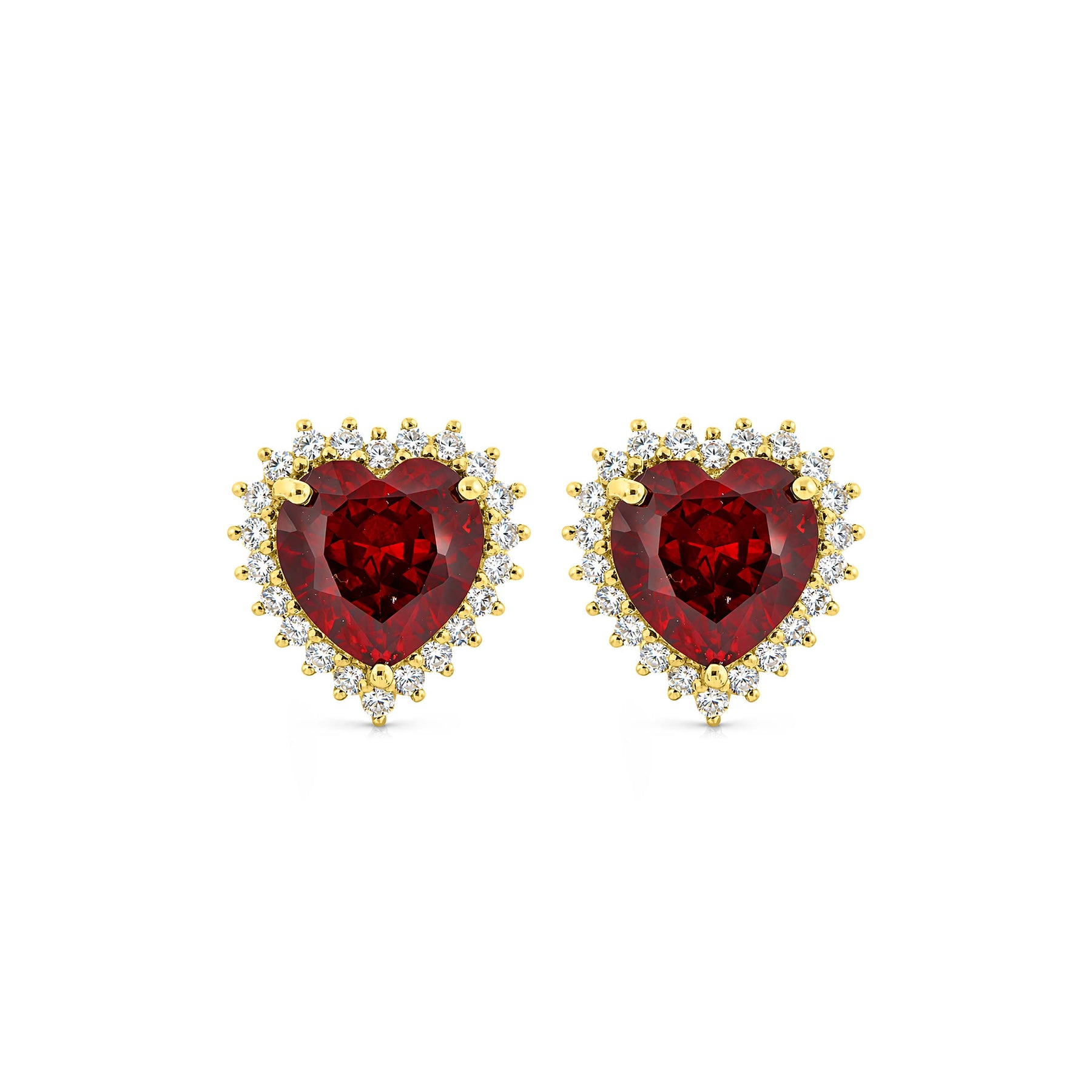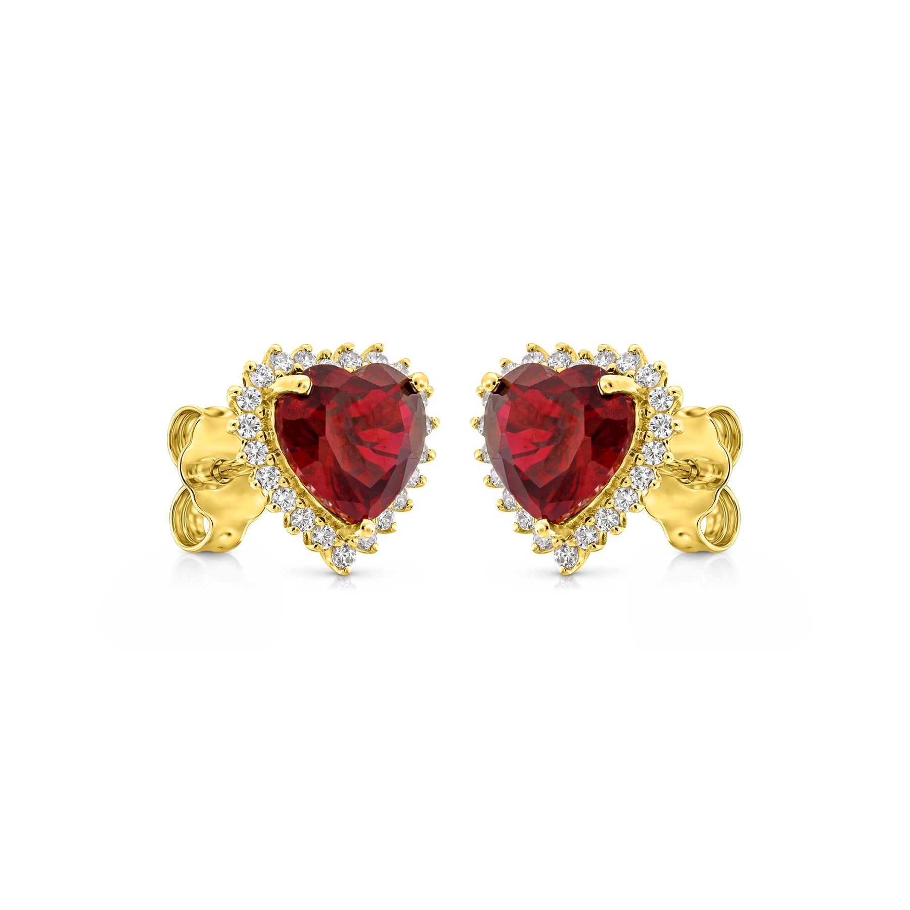 זוג עגילים צמודים מזהב צהוב בעיצוב לב משובצים באבן לב אדומה במרכז ומסביבה משובצות אבנים לבנות קטנות