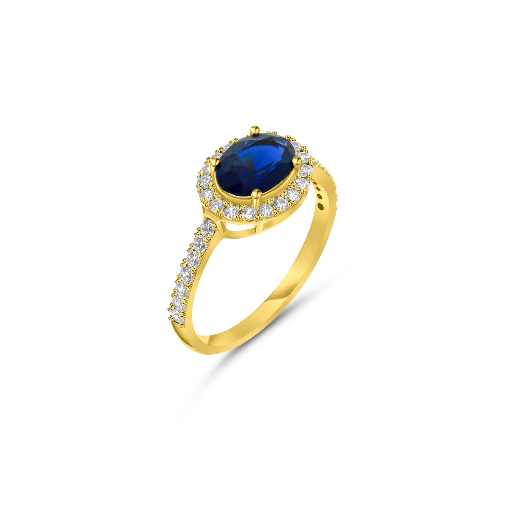 טבעת אובל מזהב צהוב משובצת אבן כחולה במרכז ואבנים קטנות נוצצות מסביב