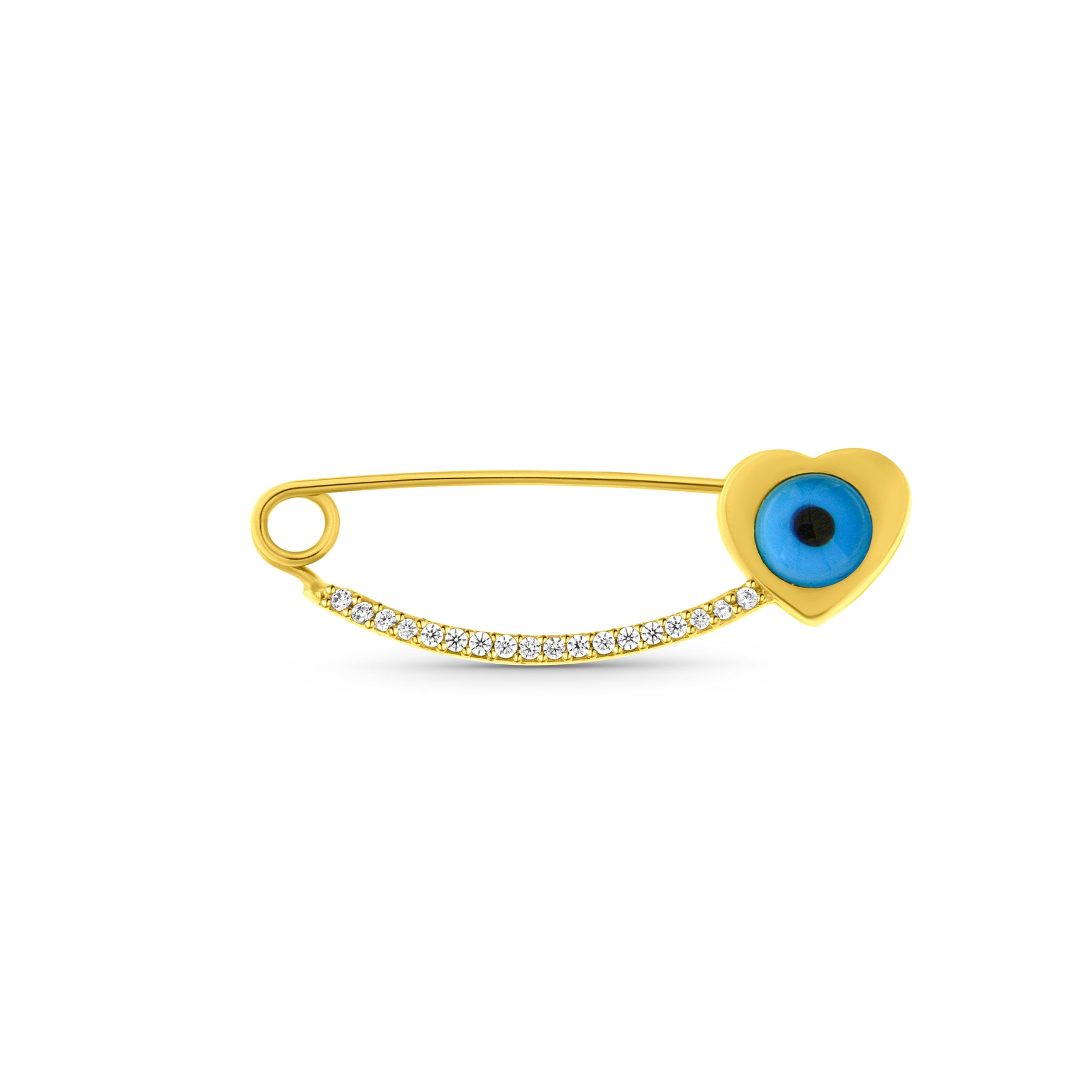 סיכת ביטחון מזהב עם עין כחולה בתוך מסגרת של לב ופס של שורת אבנים נוצצות